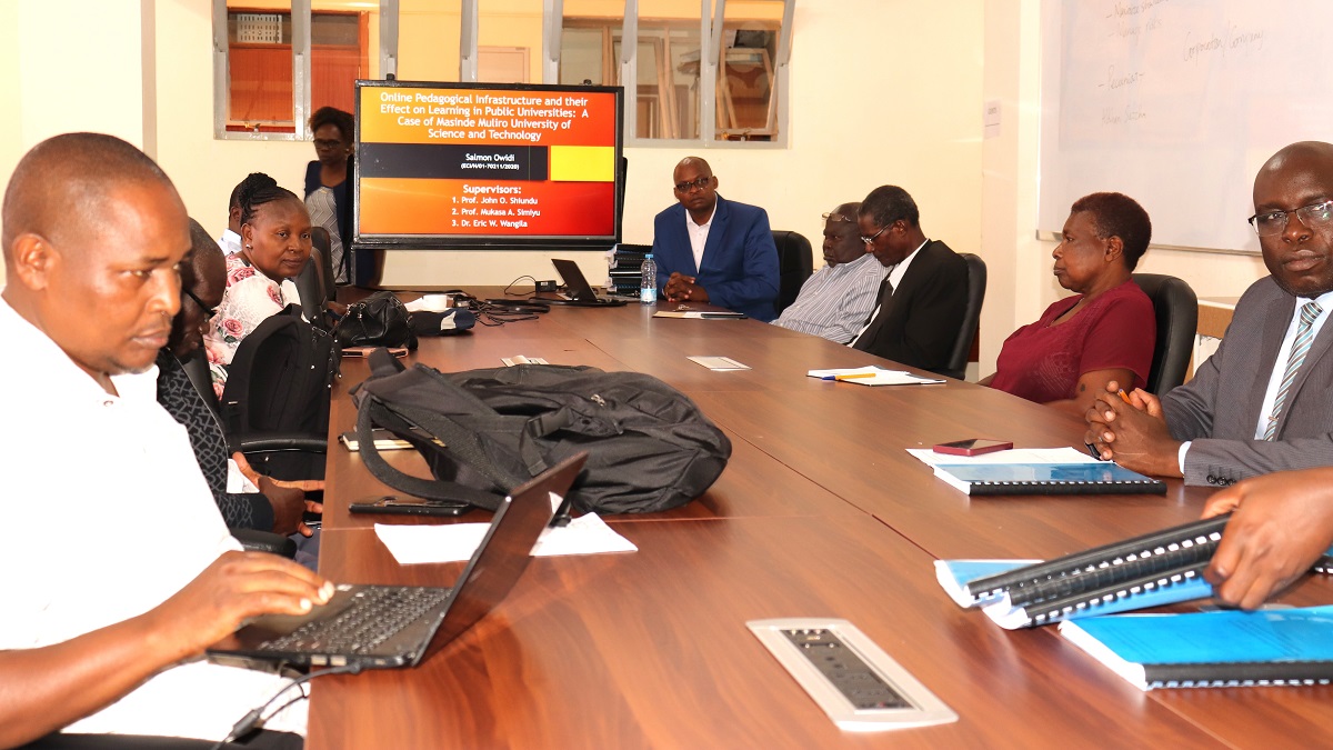 Mr. Salmon Oliech Owidi, has today-13th February, 2024, successfully defended his PhD thesis titled ‘Online Pedagogical Infrastructure and their Effect on Learning in Public Universities. The Case of MMUST, Kenya’. The thesis was examined and reports from all examiners were received by the Directorate of Postgraduate Studies (DPS). His supervisors are; Prof. John O. Shiundu, Prof. Mukasa A. Simiyu and Dr. Eric W. Wangila.